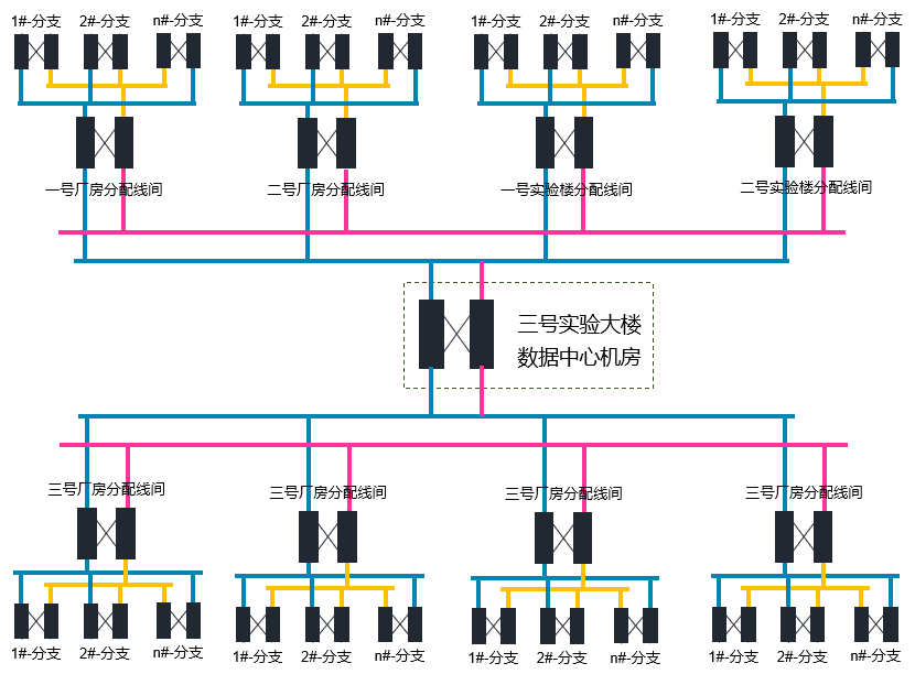 1、數(shù)據(jù)中心機(jī)房至匯聚中心至各樓棟分支機(jī)柜采用大對數(shù)電纜